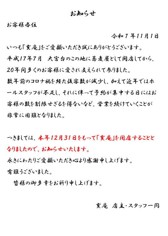皆様のご来店を、従業員一同、心よりお待ち申し上げております。 亥庵[いおり]